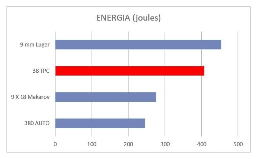 The cartridge uses the same 124-grain 9mm projectile as 9×19, which means reloading wouldn’t be difficult. It delivers about 90% of the power of the 9mm Luger cartridge and is 40% more powerful than the .380 ACP. The .38 TPC reportedly has a max chamber pressure of 35,000 PSI, which is the same as that of most standard 9mm loads.