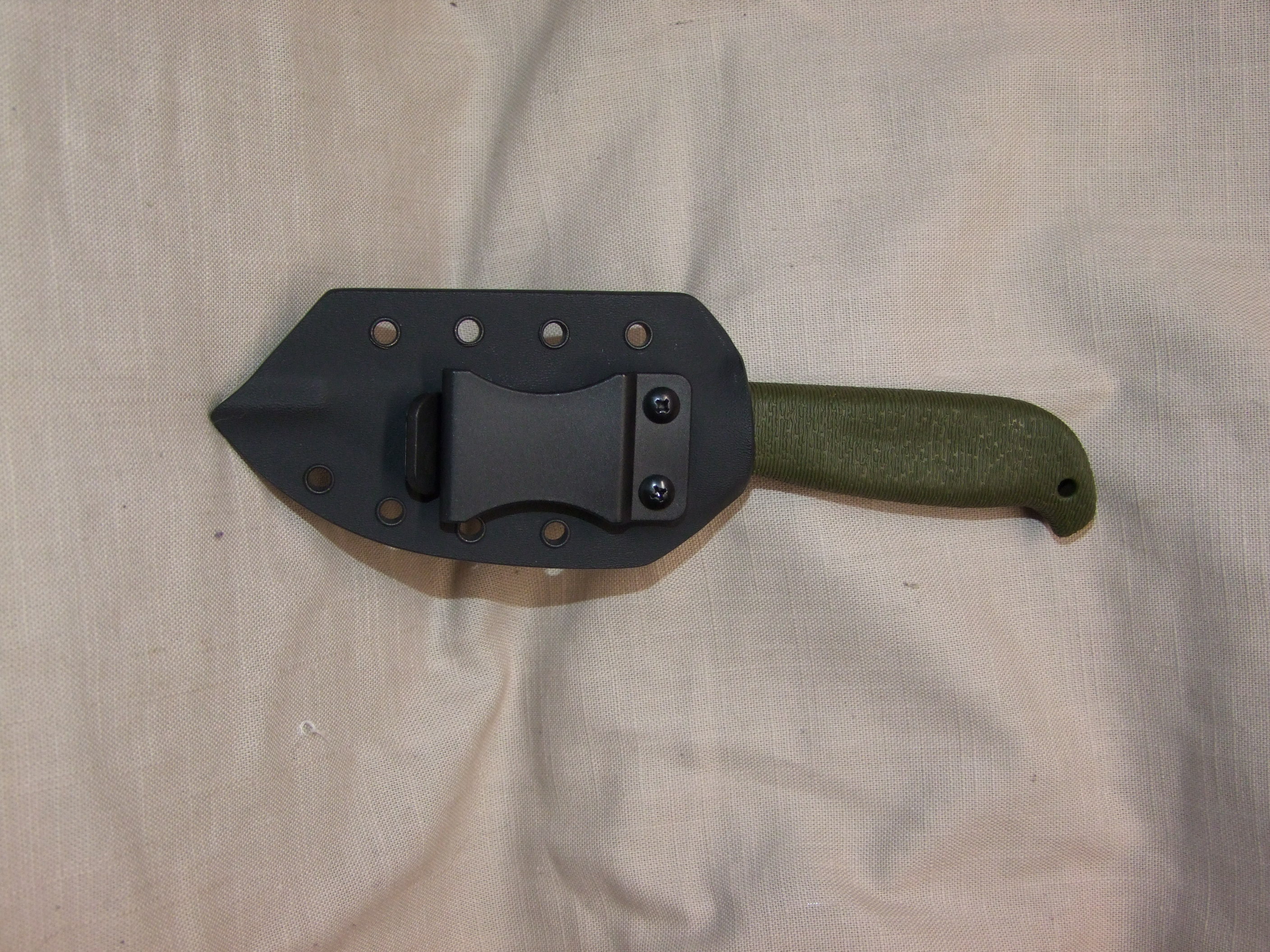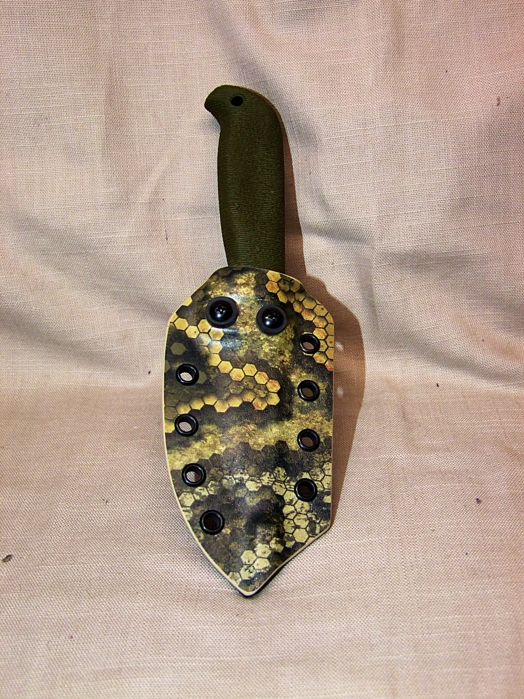 I figured I would put 3i’s custom work to the test on a Cold Steel knife I had been given a few years ago. The OEM sheath was not what I needed. Since Scott had told me he does custom knife sheaths I sent 3i the knife. My desire for this sheath was simple; a camouflage to compliment the handle and a clip that will stay secure when I carry the knife. The end result was a sheath the rides perfectly behind my handgun, if need be it will attach to my field pack.