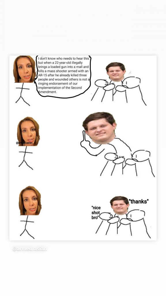 So, when two individuals, the shooter and our hero Eli Dicken, violated the no shoes, no shirt, no service, and please bring no firearms signage, a policy that carries about as much force as a quiet fart, and then the one of those individuals who was intent on carnage was stopped within 15 seconds by the other… we are to decry the actions of the decisive and effective hero?