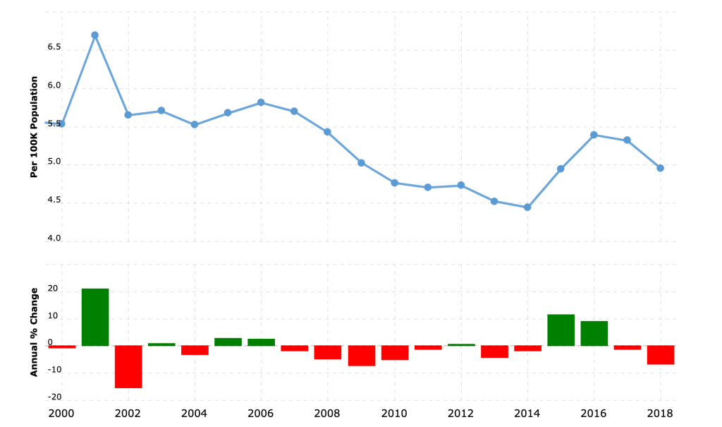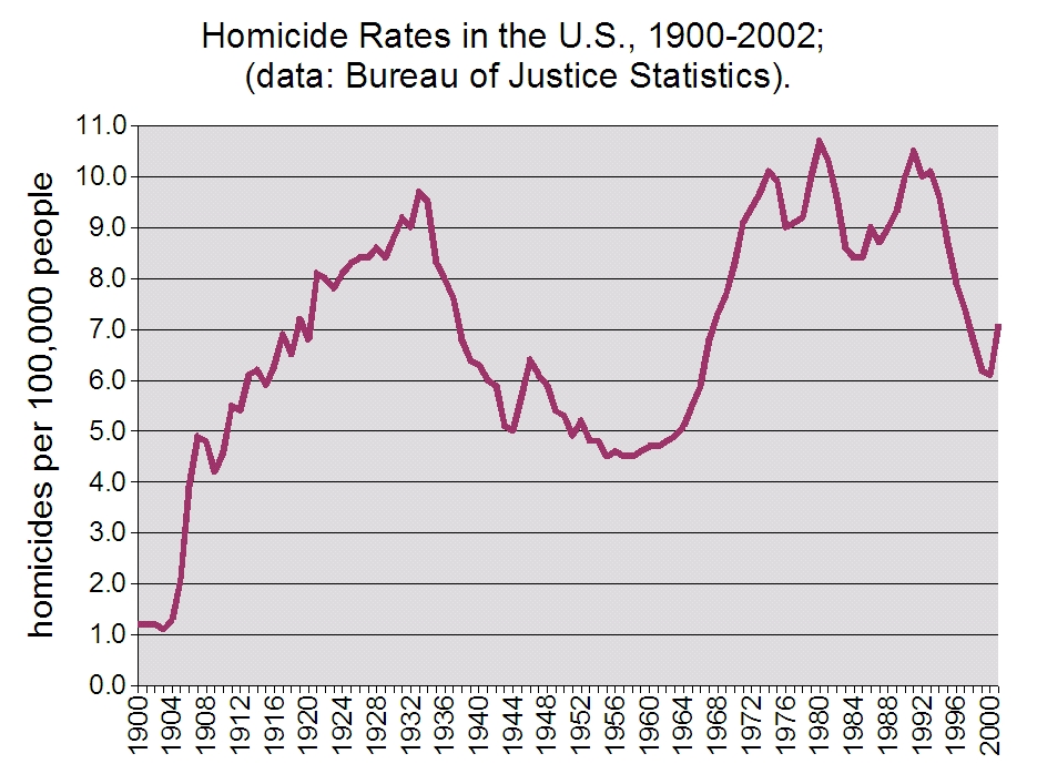 No. Not unless there is about a 20 year gap between murder spikes, completely independent of firearms sold. 2020’s spike didn’t reach the absolute level of the 2001 spike, this with firearm sales volumes approximately 4.4x higher in 2020 than 2001. 6.1 deaths per 100,000 for 2020 compared to 6.7 per 100,000 in 2001, against the NICS Checks at 39.7 million in 2020 and only 8.9 million in 2001. Why was 2001 a higher spike than 2020 with much lower volume in firearms transfers and the assault weapon ban still being in place? It was not as large a percentage spike, only about 21% compared to 2020’s 35%. But in absolute terms 2001 had a higher murder rate than 2020 by almost 10%. As bad a year as 2020 was it was still less violent than 2001. It was also less violent than 1997 and back.