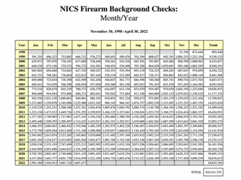 Firearms sales dipped a little in 2021 but our information is indicating deaths went up. Sales may have dropped a little, but taken in the wider context of it being the second year of the pandemic and post riot stresses, the numbers staying elevated makes sense. I suspect 2022 is going to be higher than 2021 but not by much and I may be wrong and we will see a slight drop as we saw certain stresses ease into an equilibrium again. Sales of firearms have fallen off sharply to back between 2019 and 2020’s numbers, again no correlation of sales to deaths is attributable in a vacuum.