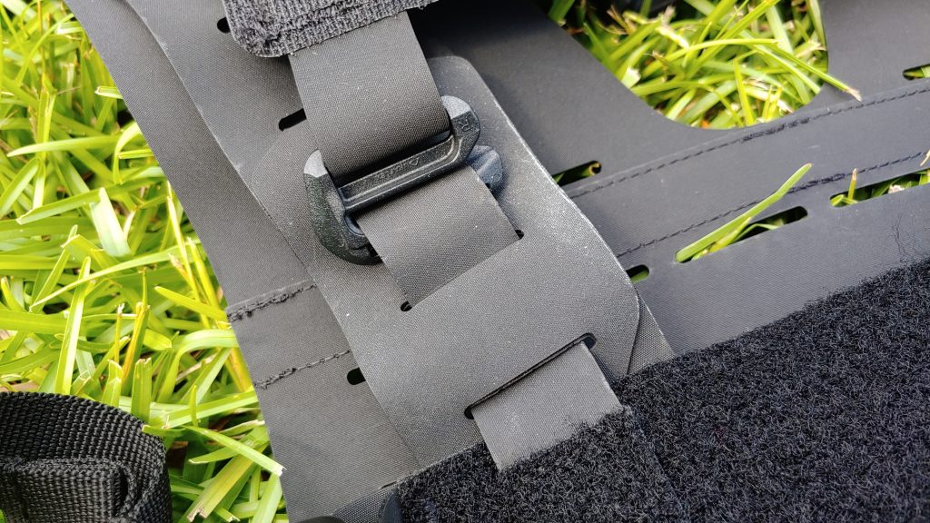 Once adjusted, the extra material is tucked away into the chest rig and presents a clean, 1st Sgt appealing look to it. With everything tucked away, the breakdown is super clean and strap-free.