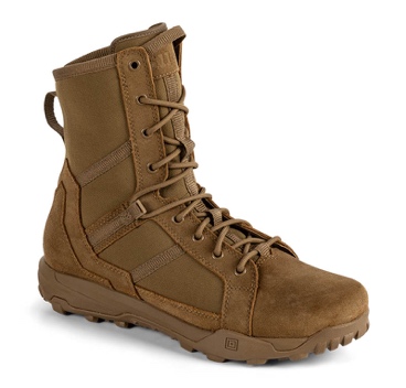 First up is the new A/T 8” AR 670-1 boot. It’s built for and approved for use by the military. It has AR 670-1 certification coupled with 5.11’s A.T.L.A.S. (All Terrain Load Assistance System) technology. The boot features a suede and 1200D nylon upper, Echo Foam high energy return, Force Foam lightweight impact cushioning, and an ASTM slip and oil-resistant rubber outsole.