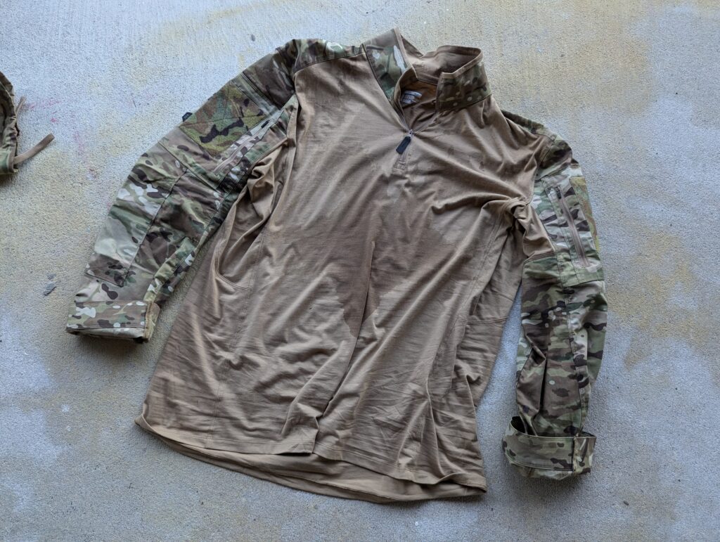 A combat shirt is a utility uniform designed to be worn with a plate carrier or other body armor type. The US Military developed combat shirts to provide soldiers with a cooler, lighter-weight uniform that can breathe when worn with body armor. The sleeves take on the color of the combat uniform and often have the same thick nature to protect the arms. The torso portion is much more lightweight and lacks a camouflage pattern.