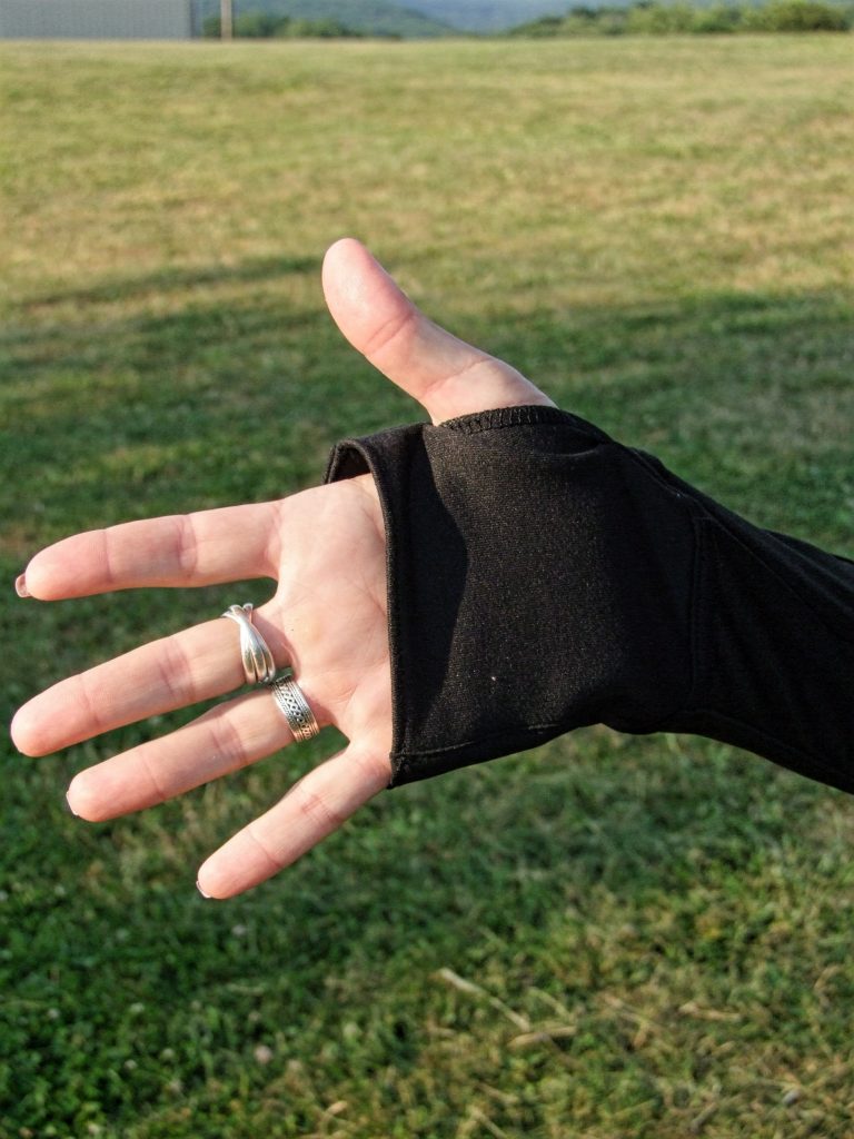 Thumb hole sleeves have become very popular. They keep the sleeves from riding up when layering under another jacket and help break the chill.