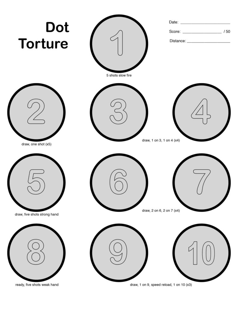 Dot Torture targets consist of ten 2-inch dots on a piece of printer-sized paper. They are sold everywhere, but they are most commonly printed. Dot Torture targets are a fifty-round training evolution that works the most basic skills in the handgun world. There are variants for DA/SA guns, snub-nose revolvers, rifles, and more.