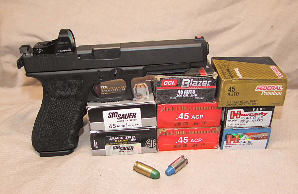 The real test would be shooting the “race Glock” for accuracy and reliability. I gathered test ammunition from Black Hills, Federal, Hornady, Sig Sauer and reloads from my Lee Pro1000. Bullet weights ranged from 185 grain hollow points to 230 grain full metal jacket as well as some 230 grain +P hollow points. While I would primarily be testing the Alpha Wolf/ Burris set-up, I also wanted to see how much Point of Aim/Point of Impact variance there was between the compensated and non-compensated barrel.