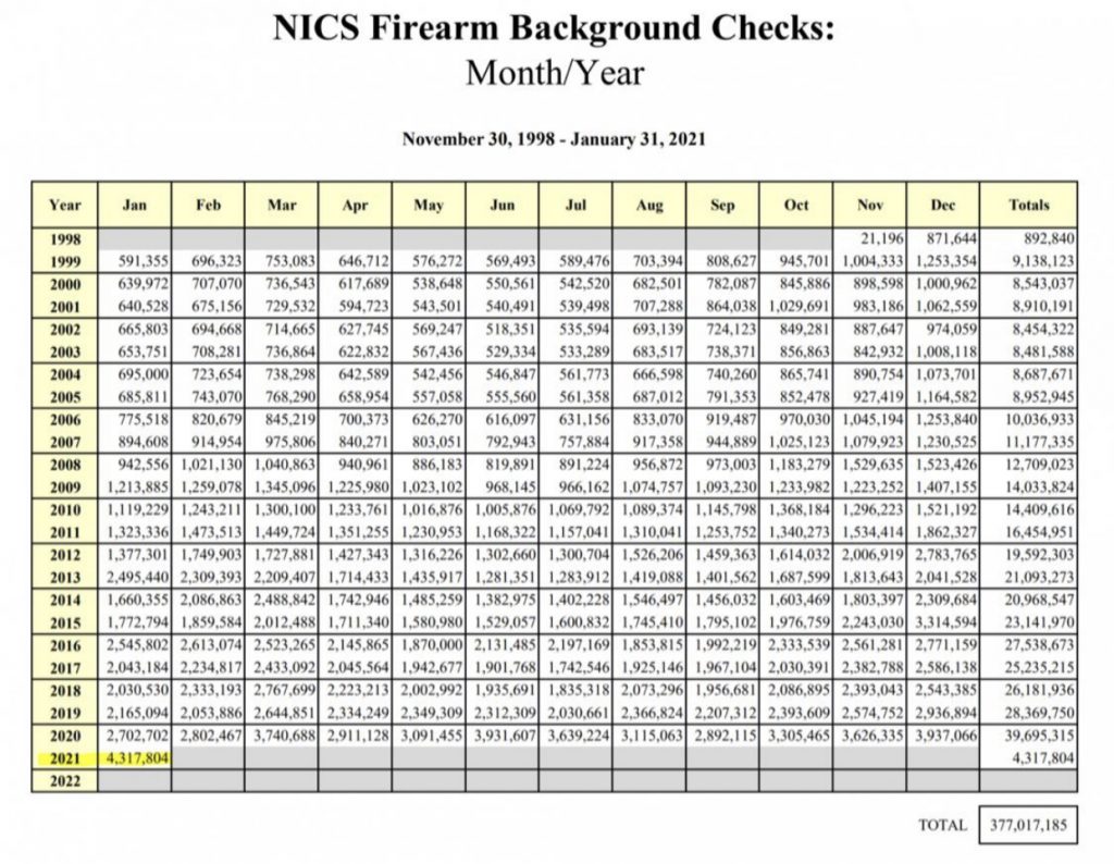 The following condensed chart is from TacticalGear.com and compiles estimates and available NICS data from 2020. There are some raw errors (like listing Michigan as a NICS exempt state) however the data matches what has been more widely reported from different sources on the raw numbers nation wide.
