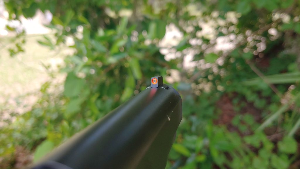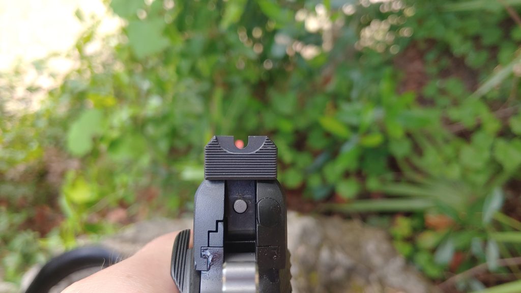 It sits nice and high and is easy for the eyes to find. The front sight is a day and night sight with an orange luminescent insert and a tritium vial. The front sight is relatively small but still eye-catching.