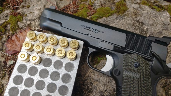 This gun mixes a lot of new with a lot of old. The Vicker Tactical Master Class 1911 has a lot of classic cool to it. The weapon is a 45 ACP design with a 5-inch barrel, and a GI recoil system.