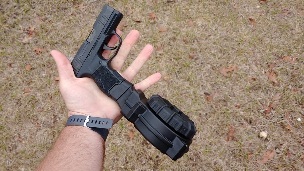Let me answer those questions. First and foremost, I don’t need much, and I don’t need a drum. It’s not a bill of needs, it’s a bill of rights, and if I want one, it’s my right. Who invented this SIG P365 drum? Well, believe it or not, it was ProMag. I want one because it’s utterly ridiculous. Something about the fact that it exists pleases me greatly, and I knew I had to have one.