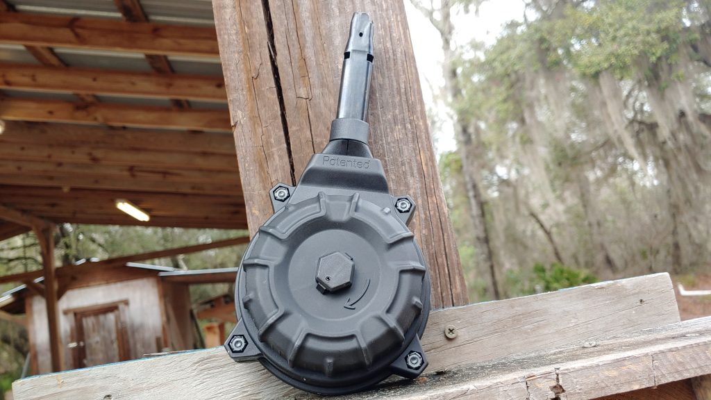 The drum does not engage the slide lock when empty and allows the slide to slam home. This wasn’t just a case of my big thumbs pinning down the slide lock either. I rested the drum on a surface and used it as a monopod with a small table, and it still functioned fine. That’s about as useful as the drum gets in practical shooting.