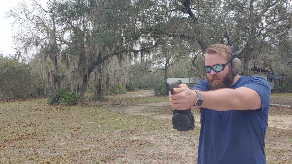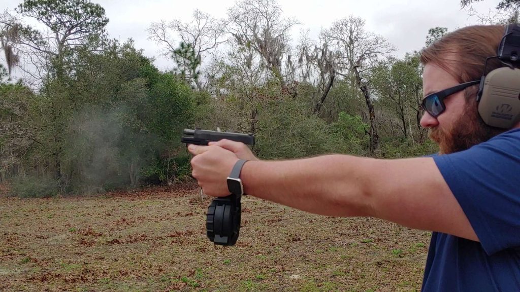 Once the gun was loaded, I let loose. To best test the drum, I started firing the weapon slowly, taking my time between shots and working the fundamentals. We are in an ammo drought, so I figured even with something as goofy as the P365 drum, I shouldn’t just waste ammo. I fired ten slow-fire shots before deciding to stress the drum a bit.
