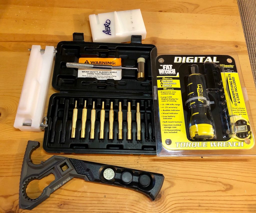 You may notice that my “work bench” is a little … atypical. That’s because I put it together from random unused pieces of furniture in my basement. After the parts order, I realized that I was going to need an organized cleaned-off surface upon which to create my new gun. It needed to be somewhere I could attach a vise – which left out the kitchen table. Thus, I now have a board-covered table top and some short file cabinets in which to store my tools – all tucked into my gun corner of the basement. Now that I have the work bench and tools, it gives me an excuse for this to not be my “only” build.