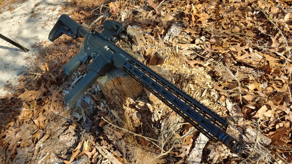 Ergonomically my setup is quite light for a rifle. A lot of weight is shaved in the front via the Atlas rail system. It’s skeletonized to a near extreme degree. It’s M-LOK compatible with a full-length top rail. As a blowback 9mm, you are dealing with a hefty buffer, 7.7 ounces, to be correct. This situates a good bit of weight to the rear and makes everything nice and balanced.