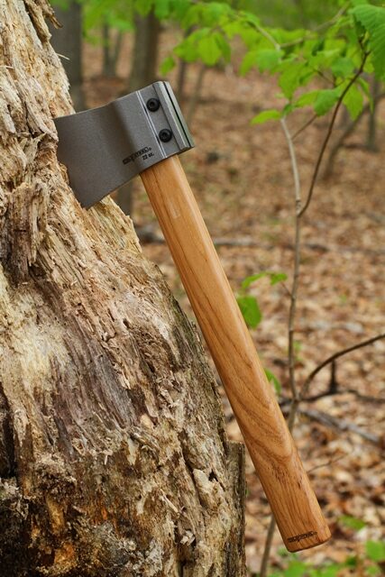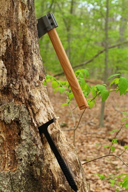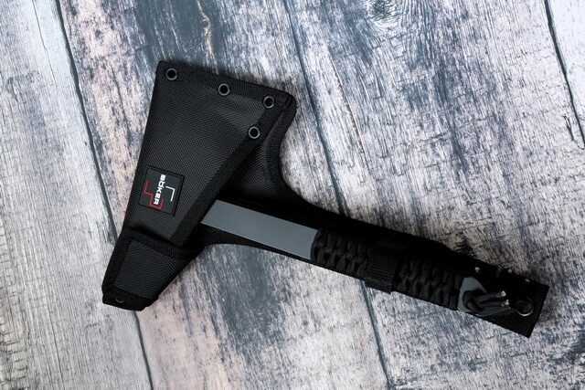 Cold Steel ships the axe with a secure rubber blade guard instead of a sheath, making it safe for transport and hiking.