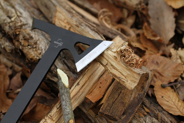 The author pushed the Boker Mochican into woods utility duty. It handled light chopping, kindling splitting, and feathering.