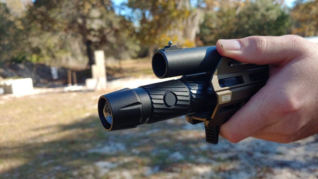 Ergonomically this light takes some practice to properly use. Grip near the end of the pump and extend your trigger finger to activate the light. Working the pump and the light together is possible. It takes some practice, but it’s possible. It’s not as easy as a pump mounted light to use and practice with, but the light itself doesn’t have to move as you rack the pump. The light stays on target as you work the weapon and pump.