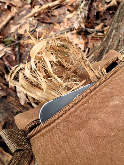 On another occasion, I stored Poplar bark in the supplied BCO Small Zip Pouch for marginal protection from dampness. Marginal being the keyword here. The poplar bark was a little damp but quickly dried out as I repeatedly struck the ferro rod into the tinder bundle. You can consider this technique as warming or charring the tinder material.