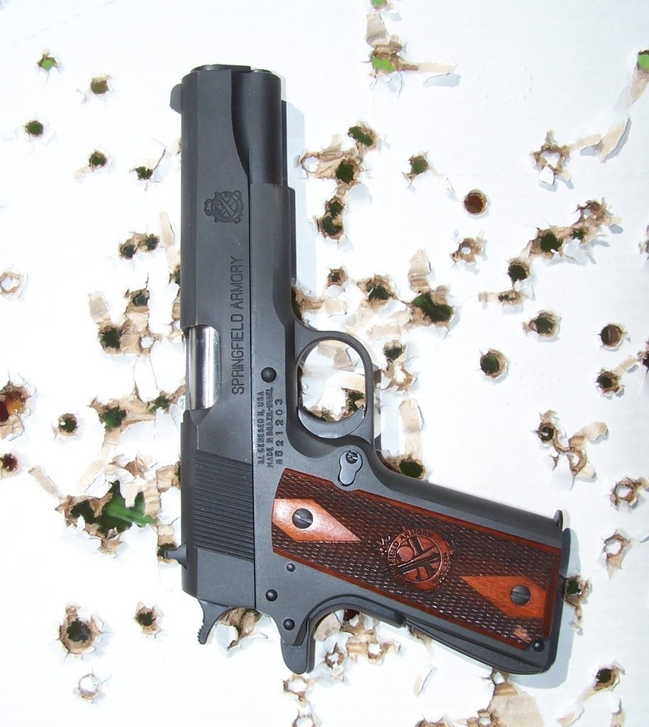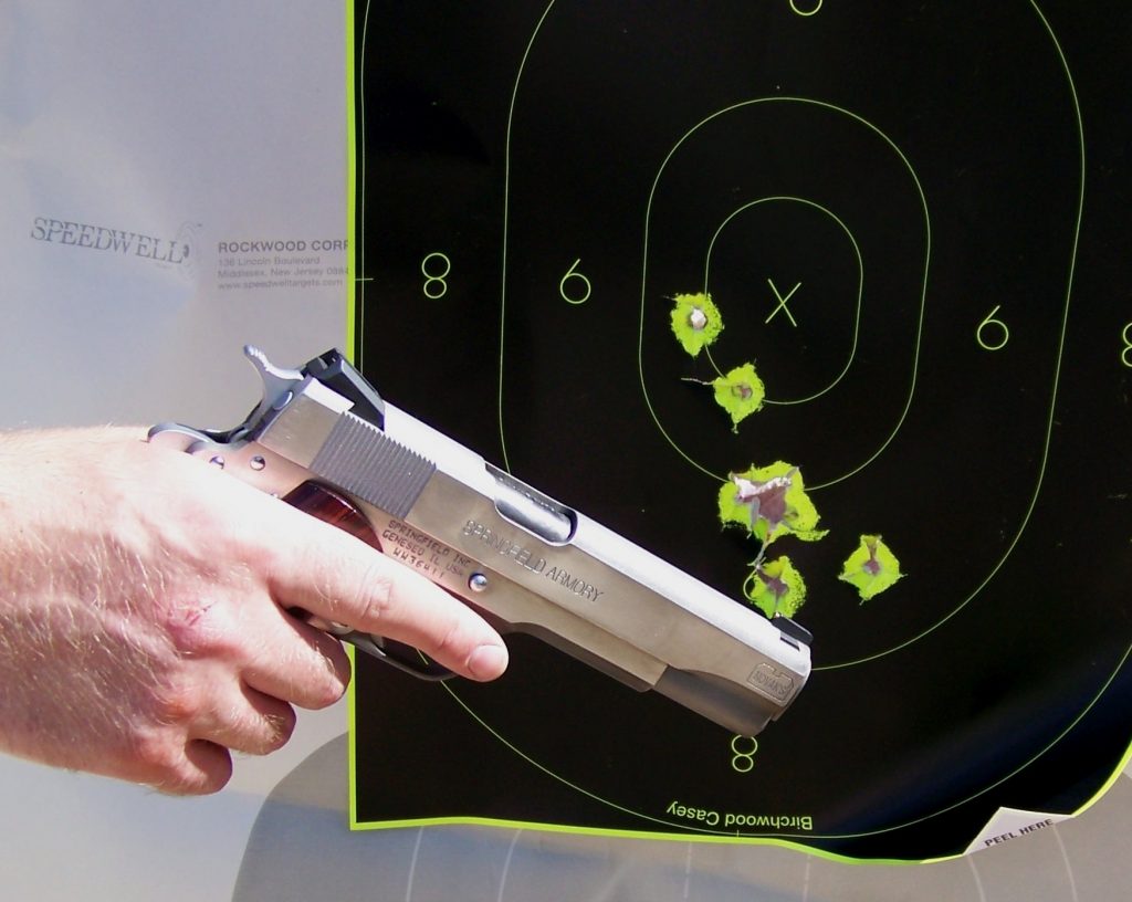 The pistol’s sights are well regulated for the six o’clock hold at 25 yards with the 230 grain load giving a dead on hold at about 50 yards. The 135 grain load struck 2.3 inch low. The Springfield Mil Spec is a great shooter for the money. It is well worth your hard earned money.