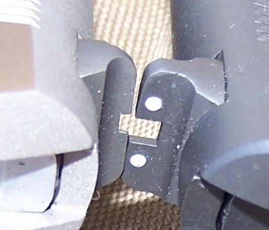 The front sight measures .12 wide as far as I am able to measure.  An .11 inch rear notch makes for a good sight picture. There is very little lateral play in the slide to frame fit. Barrel to slide and barrel to bushing fit isn’t tight but snug as it should be. There is room for foreign material and powder ash but enough tolerance to ensure reliability. The slide lock safety is tight and indents properly. The grip safety should release its hold on the trigger about half way into compression. The Springfield requires the grip safety be ‘mashed’ nearly to the frame so be certain you have a good hold on this 1911.