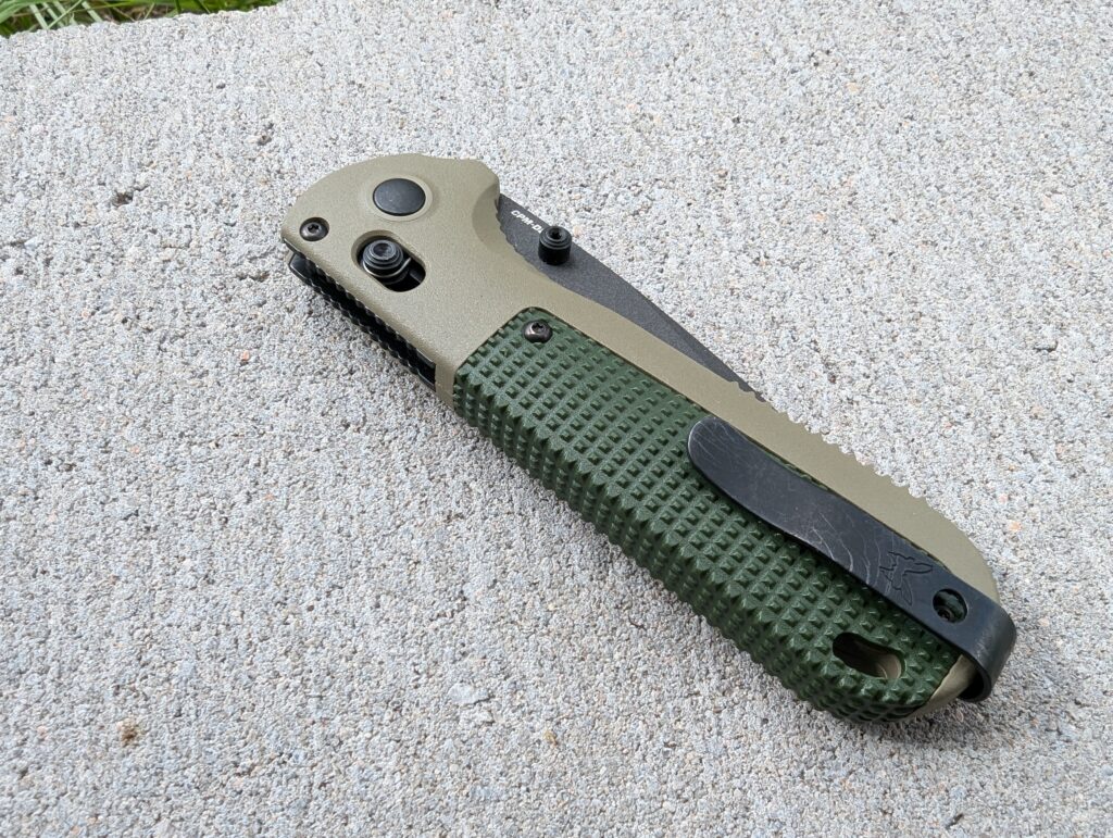 Grivory is odd branding, but I can’t complain about how it feels in my hand. The material weighs very little, and the knife weighs 3.7 ounces. The Grivory material has a multicolor design. The majority of it is green, but there is a heavily textured darker green portion. The texturing wraps around the sides and over the top of the grip. Up front, there are two sections with additional texture.