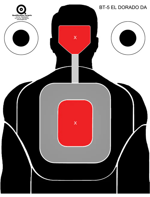 The BT-5 target series is fairly popular and consists of a vague silhouette of the chest, shoulders, and head of a threat. Inside sits several rings with various numeric characters for scoring. It’s good, but the El Dorado DA version is better. The numbers are gone. Instead, we have three colors, black, grey, and red.