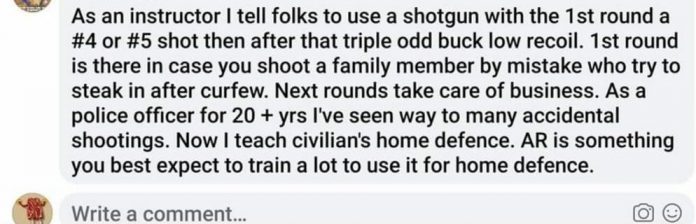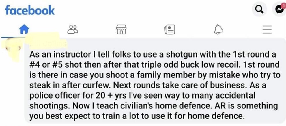 This instructor is literally giving advice on the first round in a shotgun being IN CASE YOU SHOOT THE WRONG PERSON. Because that is what you want to say aloud in a court judging when you shoot someone, that the round you loaded and shot at someone first was specifically because you planned to get it wrong. I could bet he’s the type that says you should toss your flashlight away to distract the bad guy, or that the sound of a racking shotgun is ‘intimidating’ so you won’t have to shoot someone, or many other Fuddlore anecdotal pieces of anti-wisdom. They are stupid, assumptive, and only sound ‘good’ because nobody is bothering to critically tear them apart to find the flaws… Kinda like gun control, funny enough.
