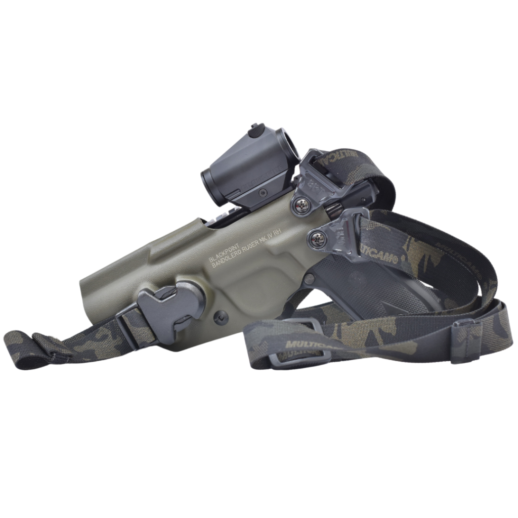 The BlackPoint Tactical Bandolero holster is constructed of molded Kydex. It is currently available in OD green and has a black Multicam nylon strap. It weighs just under 5.6 ounces. The Bandolero’s MSRP for the Browning Buckmark or Ruger Mark IV 22/45 is $99.99.