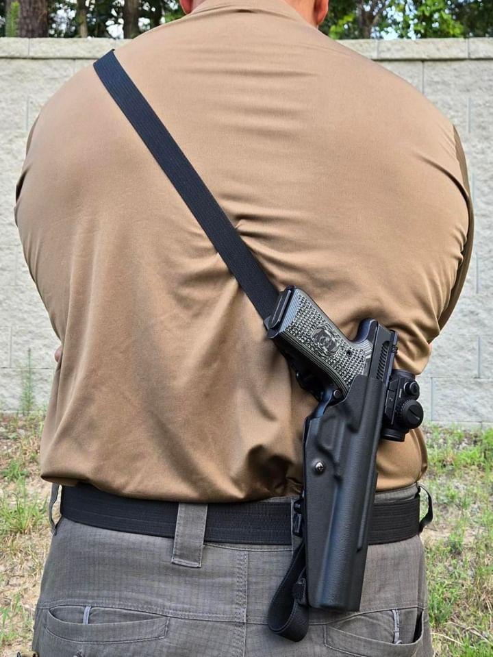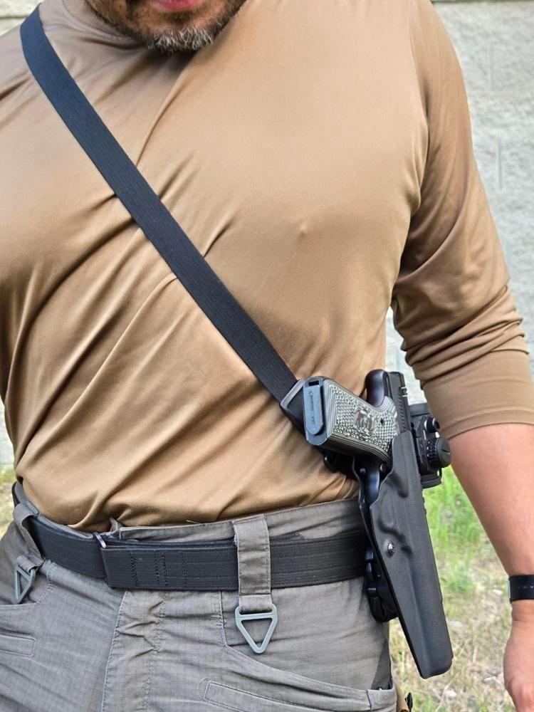 The Bandolero can be adjusted so that it can be slung behind the back, out of the way, if needed. Most chest-mounted holsters have fixed positions, but I like the flexibility that the Bandolero offers. Just like with a rifle on a two-point sling, there are times you want to flip it around to the back to get it out of the way if you need to bend down to perform a task.