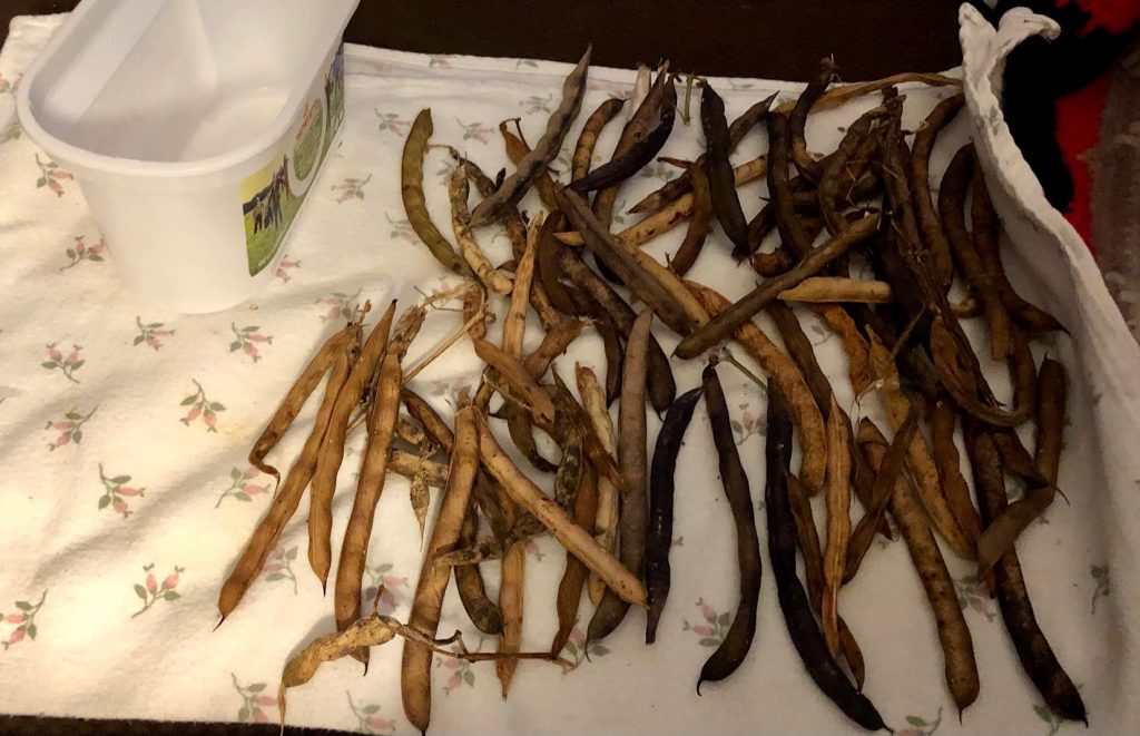 As a novice, it was interesting to me to watch the bean progression through the growing season. The bean vines grew up and were supported by the cornstalks as expected. Then the pods gradually went from green (like regular green pole beans) to purple pods to dry papery pods with black beans inside. As the pods turned papery I slowly harvested them and let them dry further inside the house.