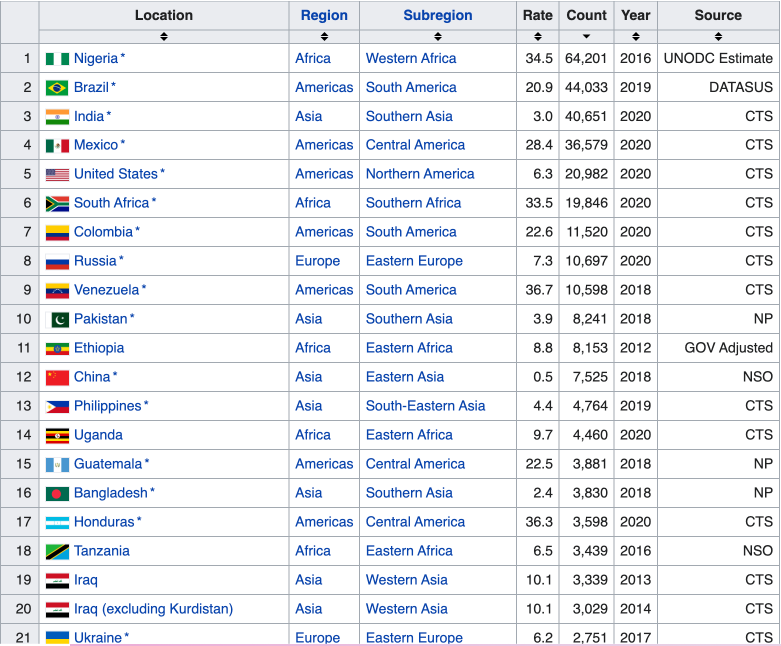 The United States ranks 59th in the world for homicide rate. We are the 3rd largest country in the world but only the 5th in total homicides with only India ranking higher in both total murders and population above us. Don’t give me any crap about the “civilized” world either, that’s a garbage lazy excuse that we somehow can only expect civilized behavior from ‘westernized’ societies of wealth. Pathetic viewpoint. Like they don’t know murder is bad so it’s just “allowed” there, huh?
