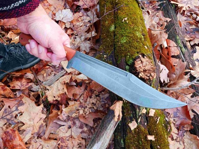 With an overall length of 15 3/8 inches and a robust thickness of .187 inches, this knife means business. The 90-degree spine adds versatility, while the Rock Tumbled Acid Wash finish gives it a rugged aesthetic that stands out from the crowd. The handle looks and feels excellent, featuring an hourglass shape and micarta scales for a secure grip, even in slippery conditions.