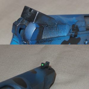 The pistol needed one more item, good looking functional grips. The Hogue rubber grips were serviceable but that was it. When I perused VZ Grips (vzgrips.com) there a pair of blue and black Diamondback G10 grips on clearance that were perfect. A few days later they arrived and fit like a glove. To finish the grip, I applied anti-skid tape to give a secure grip in any weather condition. These additions are visible in the photos throughout the article.