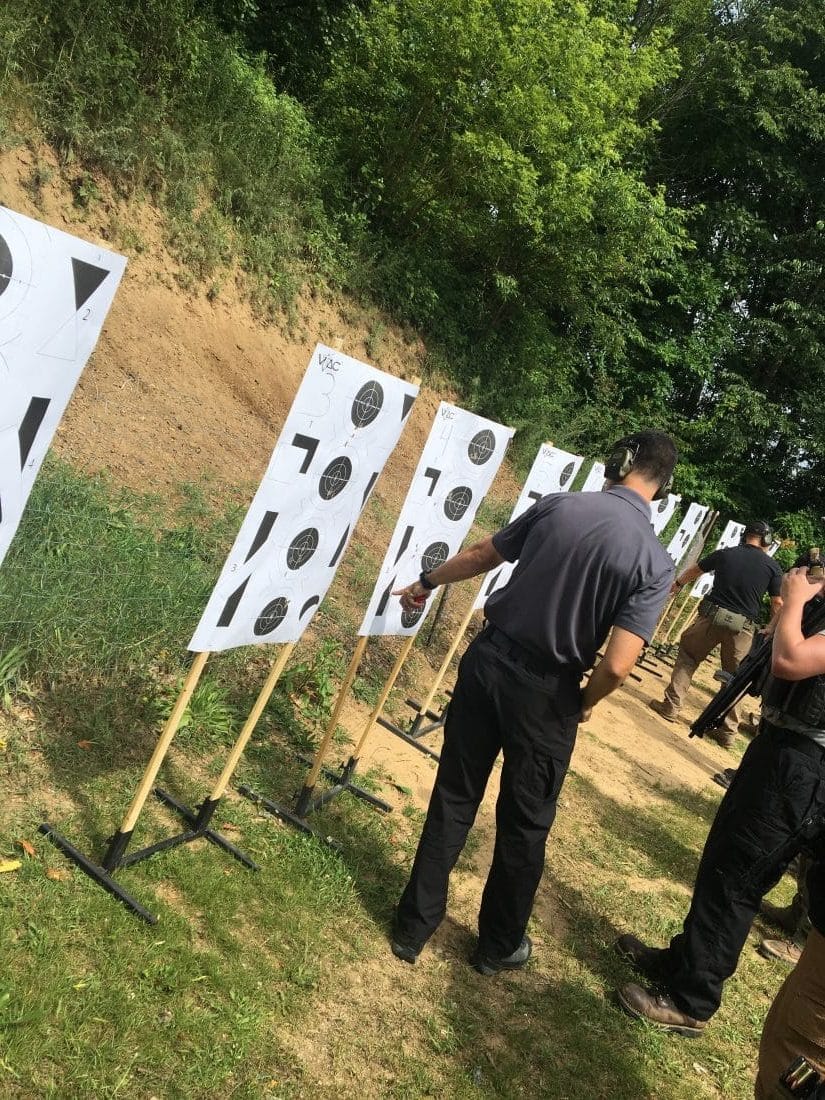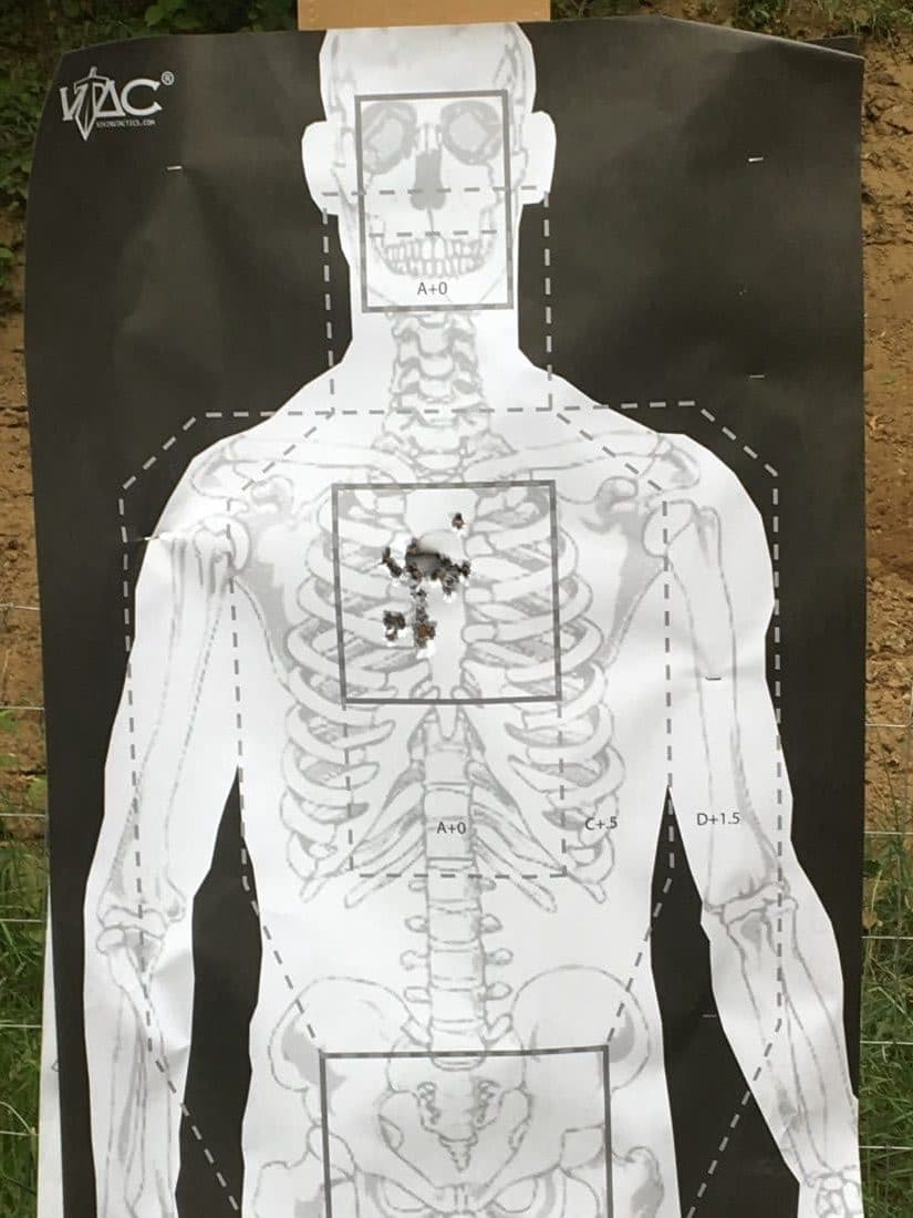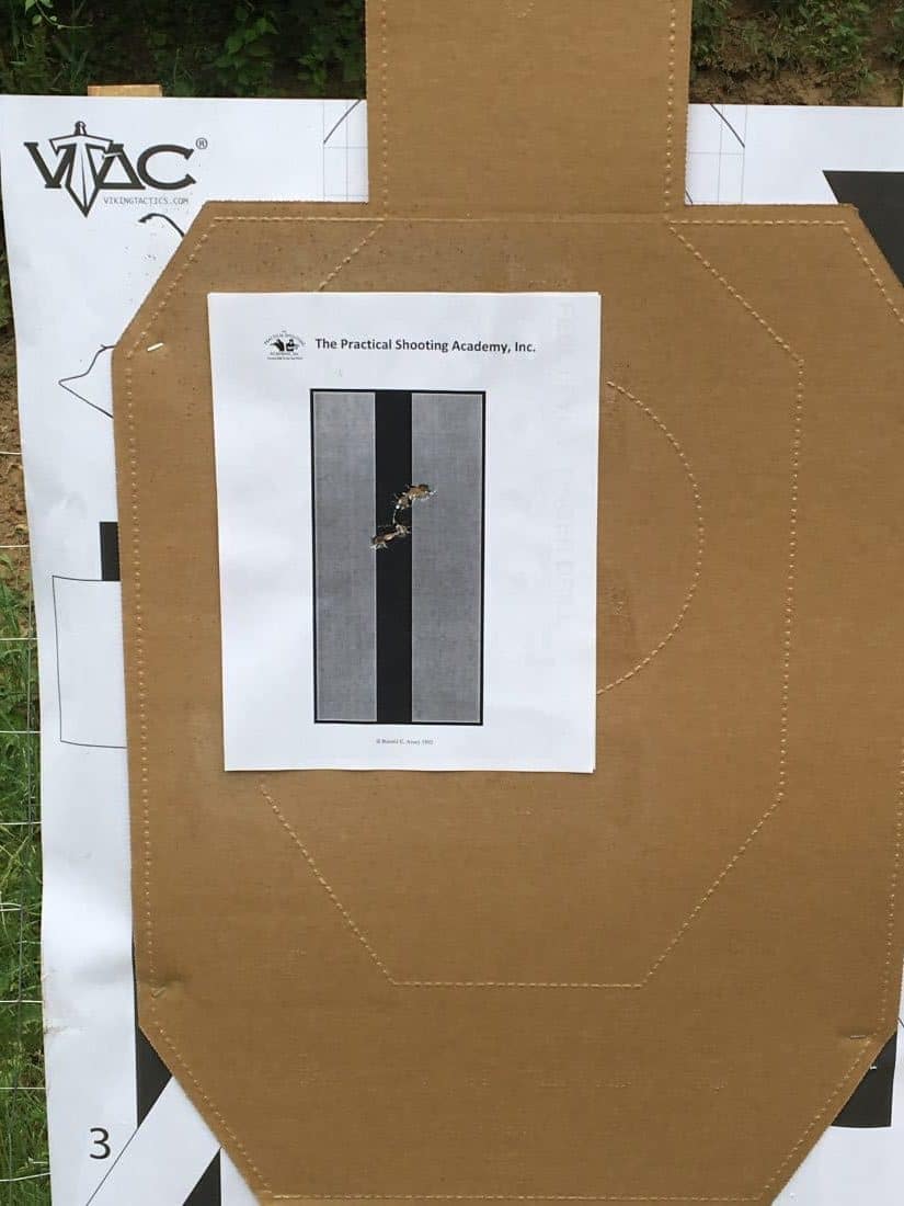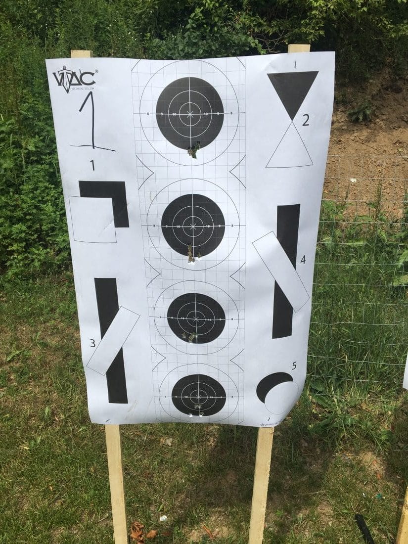 I’ve trained in ranges set like this before and so I quickly stole target 1 on the left side of the range (all brass travels right). We started zeroing with 5 rounds at 5 meters. Moved to 10 meters, 15 meters, and then 25 meters. Notice the rounds walking up closer to center as distance increases, illustrating sight height over bore (the round once fired travels up through or to the sight plane before beginning to drop as it travels further down range). We wanted center hits at 25 meters and I was a little low from my last quick zero.
