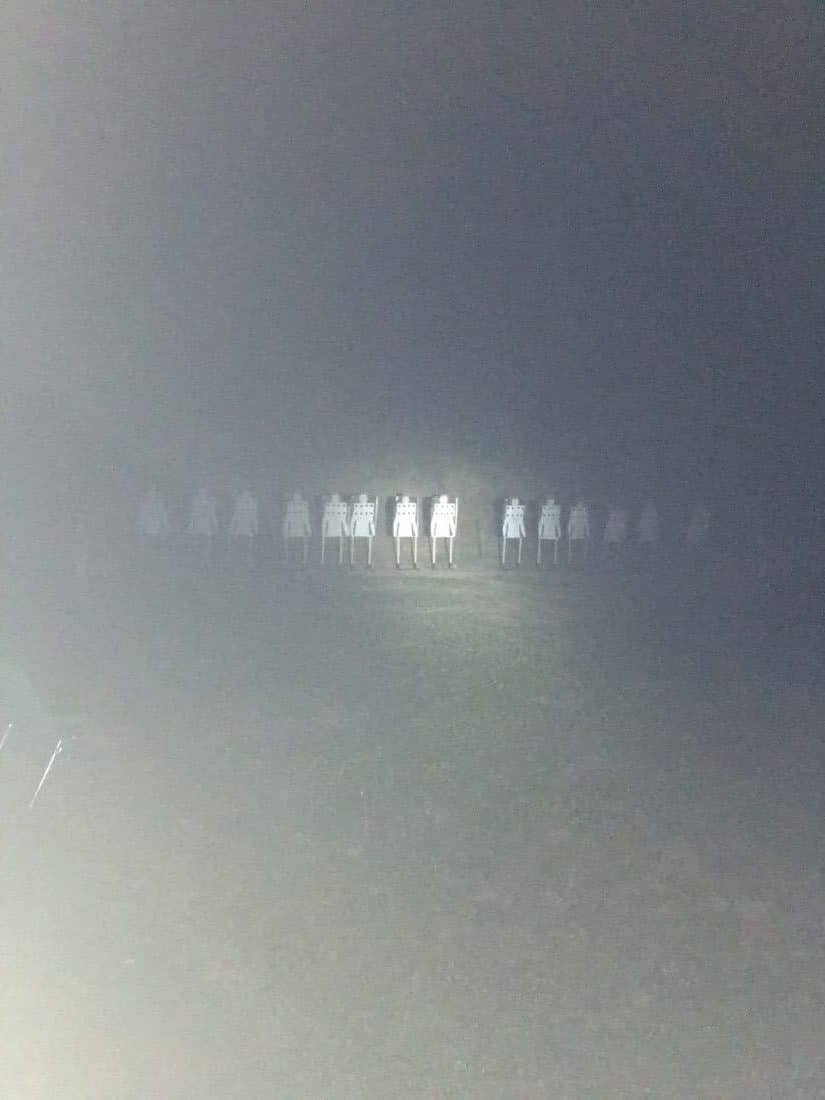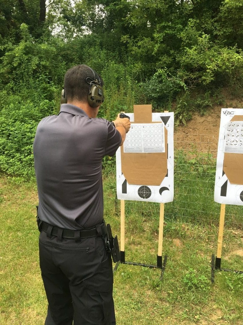 Using an adapted for handgun NPA drill (Natural Point of Aim) we fired 5 round groups for consistency without eyesight. The goal is every round breaking the line. Vertical stringing is more acceptable than horizontal.