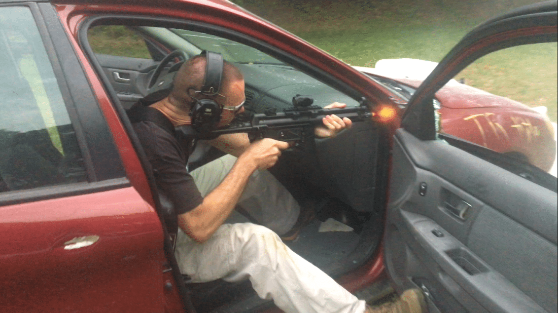 That Hollywood worthy shoot and move familiarization drill covers a great many small details you might need in an individual defensive gun use. Getting your seat belt off and clear. How to shoot through glass properly. Where your vehicle offers the greatest protection.