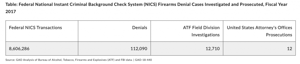 In fiscal 2017, the Bureau of Alcohol, Tobacco, Firearms and Explosives referred about 12,700 denied purchases to its field divisions for investigation. As of June 2018, U.S. Attorney’s Offices prosecuted 12 of these cases. [emphasis added]