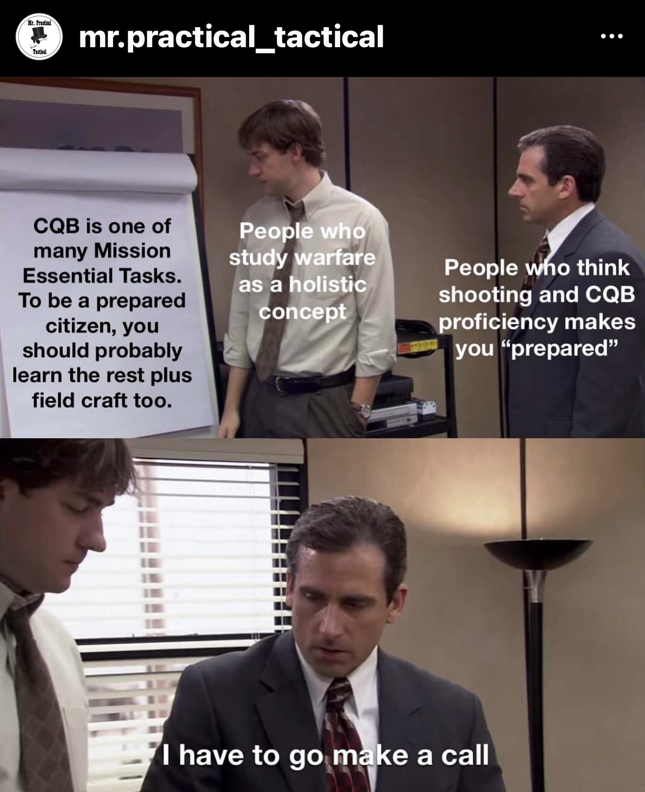 I had several discussions with support/logistic echelon soldiers about how CQB or close contact or any number of events would work and to these soldiers, just like this hypothetical civilian squad, I would advise.