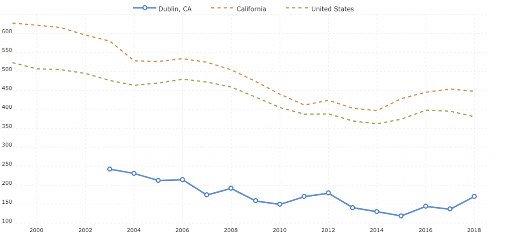 - The Dublin CA crime rate for 2018 was 170.18 per 100,000 population, a 24.6% increase from 2017.