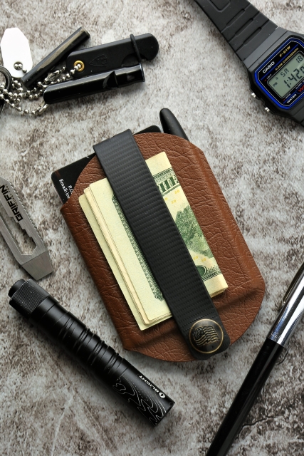 Included is a lightweight, removable stainless steel money clip with a diamond pattern, securely holding over 10 folded bills. This wallet pairs perfectly with compact knives like the Mini Seaton and pens such as the Titanium Mini Pen, making it an ideal choice for your daily carry.