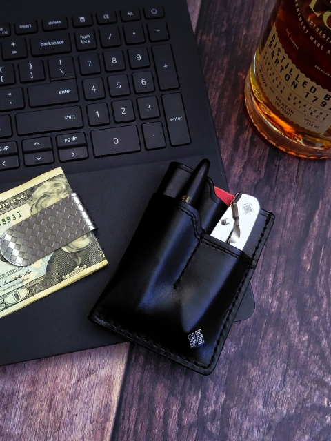 Crafted from full-grain leather, the wallet features a practical wrap-around pocket that secures your knife and pen in the front while providing extra card storage in the back. The notched top pocket allows for easy card access, and its compact design fits comfortably in your front pocket.