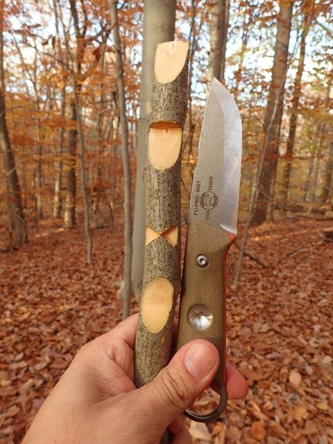 I previously used a knife with a Jason Tietz-designed fire notch with excellent results; the same goes for the new WRK&T Puukko. Notch placement is in the best possible place on the spine where it won’t get in the way of thumb-assisted push-cuts or choking up on the blade when skinning. The spine is rounded for absolute comfort when using different knife grips. As a bonus, it may also save a baton from getting shredded up too quickly. Only the notch area is sharpened for striking and scraping.