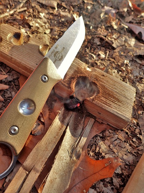 I planted the blade horizontally into a log firmly by using a baton. In that position, I scraped fatwood against the notch until I had a nice-sized pile to ignite. I used the Ferro rod to scrape back against the notch, sending hot sparks on the fatwood shavings and igniting them quickly. Testing the FC-PKO Power Puukko was a valuable experience.