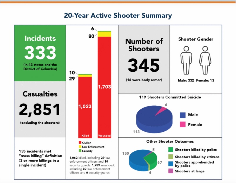 According to the FBI, a female active shooter in the US from 2000-2018 was found in less than 4% of the total incidents, and other homicide data follows a similar trend: Women murder less, per capita, than men. So much less that the female active shooter is functionally an anomaly within a dataset that’s made up of tragic but already uncommon incidents. Regardless of what the media might have to say about it. the FBI reports an average of 143 casualties/year due to Active Shooter incidents, with 57 of those being deaths. While any number of senseless deaths are horrific, keep in mind that somewhere around 2 and a half million Americans die every year, and consider the perspective this brings to a conversation that is often tilted toward accepting that this miniscule yet terrible problem is an “epidemic” of some sort.