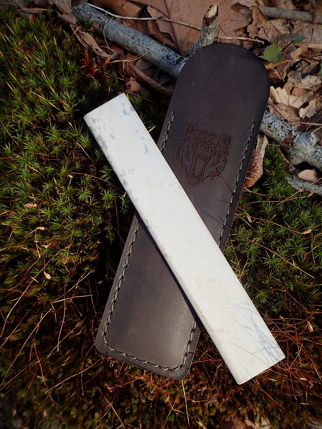 The Bear Forest Knives Whetstone and Leather Slip Strop is a premium sharpening system designed for precision honing. The whetstone is genuine Arkansas Novaculite, known for its exceptional hardness and fine grain. This makes it ideal for refining knife edges, heavy tools, and even surgical instruments.