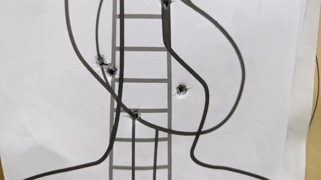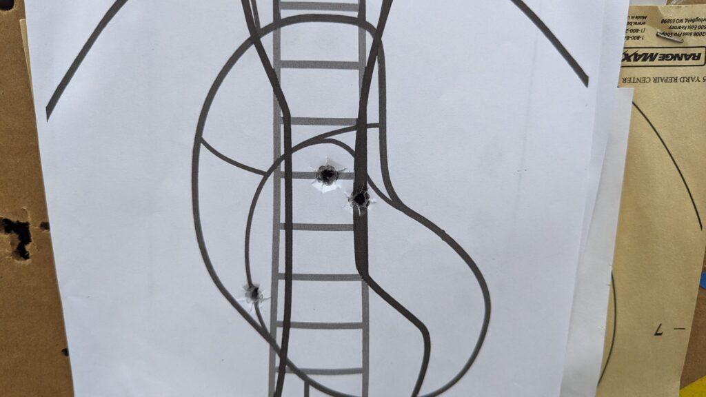 I started with a simple printed Sage Dynamics target at a mere ten yards. I began with too little finger on the trigger and fired a simple three round group. My finger was on the trigger only enough to pull it. Not bad, fairly typical. I repeated the process with way too much trigger finger, literally as much as I could put through the triggerguard. I fired my three round group and it was near identical to the first group.