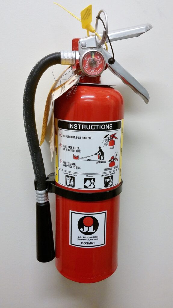Extinguishers come in different ratings based on the type(s) of fire they’re intended to put out. Look for 2-A: 10-B:C rating for home use. If you need to use an extinguisher, remember the acronym PASS.