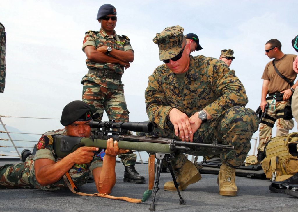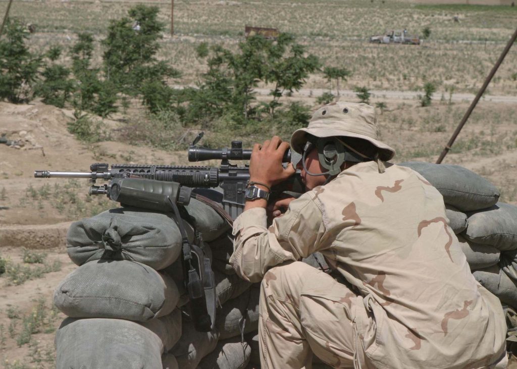 The Marine Corps then tossed on a bipod, and a variety of day optics were utilized along the way. The most common being the TS-30A2, aka the Leupold Mark 4 M3 3-9×36 scope. Marines also used ACOGs on these rifles, but the fixed 4X limited the Marine’s long-range precision accuracy.