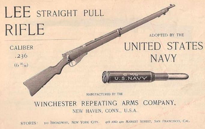 While the Army utilized the Krag, the Marines and Navy used the more modern and more capable Lee Navy rifle. This straight-pull bolt action rifle offered a faster action than the Krag and chambered an early smokeless cartridge called the 6mm Lee Navy. 6mm Lee Navy ammunition was lighter, and the Marines could carry more of it.